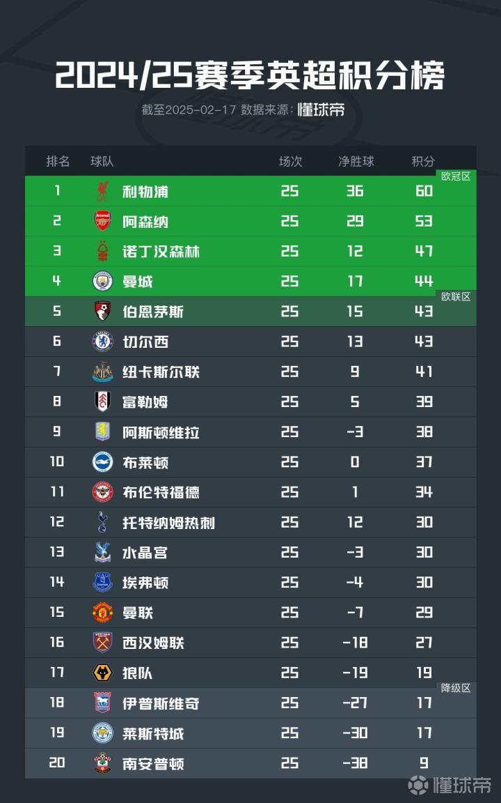 利物浦延续了领跑的位置,他们目前以多达7分的优势领先于排名第二的阿森纳。而诺丁汉森林在这一轮比赛后积攒了47分,暂列第三,曼城则以44分排在第四位。伯恩茅斯和切尔西则同积43分,凭借净胜球优势,伯恩茅斯暂列第五,切尔西排在第六位。纽卡以41分排在第七,富勒姆和维拉则分别排在第八和第九。